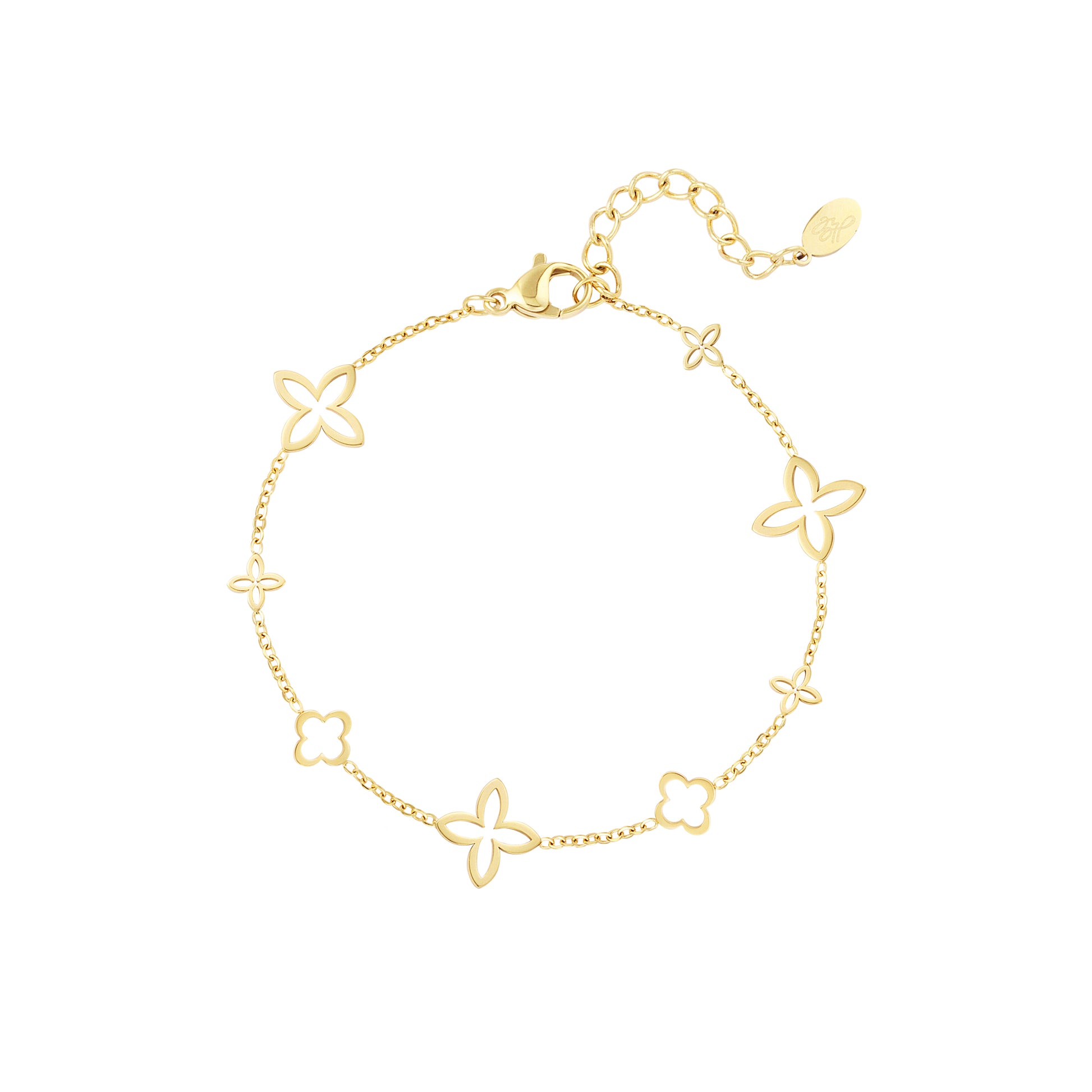 Deze goudkleurige armbandje is tijdloos en te matchen bij iedere outfits. Samen met de trendy klaver bedeltjes maakt het een perfecte combinatie voor bijvoorbeeld een leuk cadeautje. De armband is gemaakt van rvs en heeft een afmeting van 16 cm, verstelbaar tot 3 cm.
