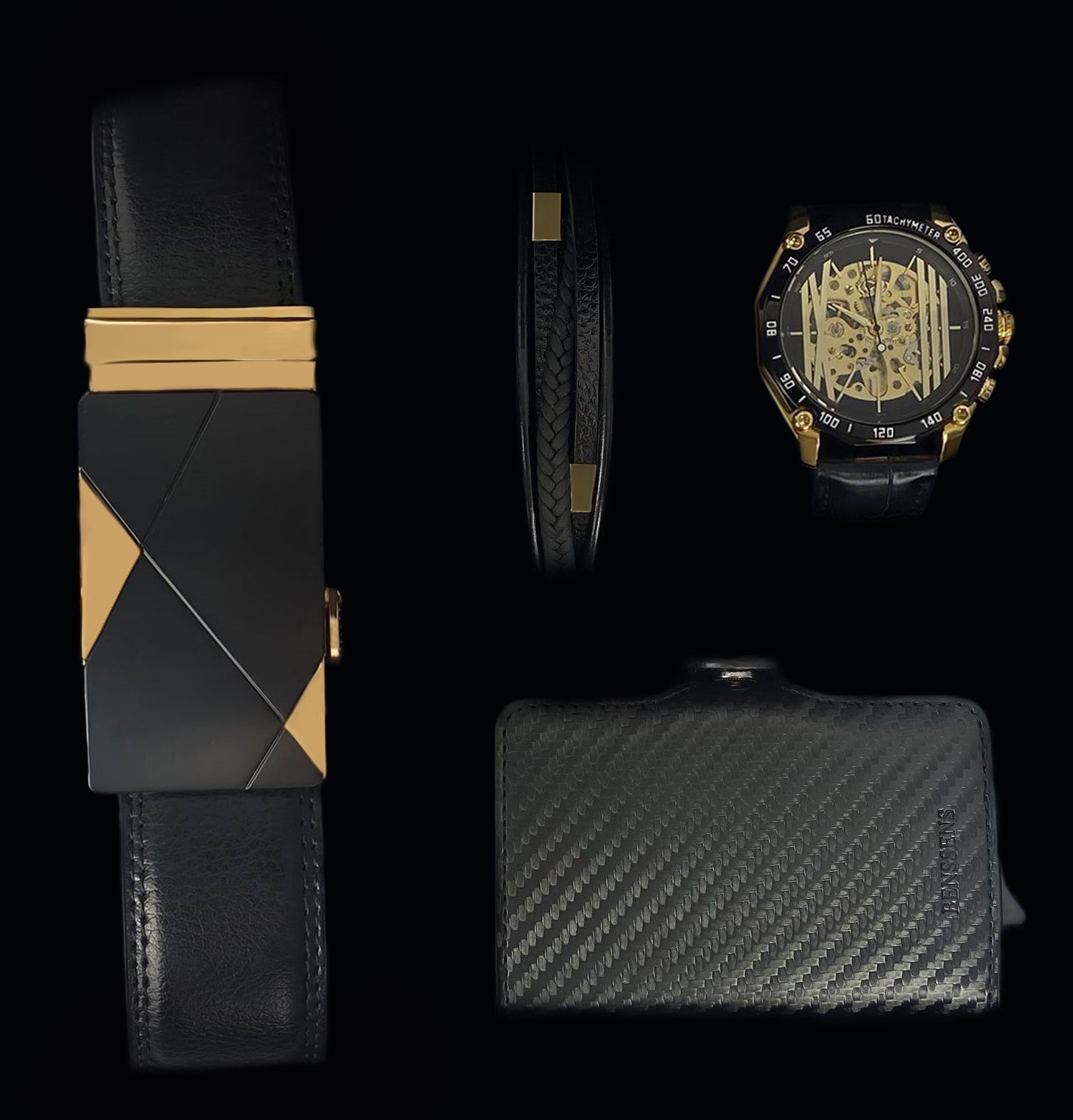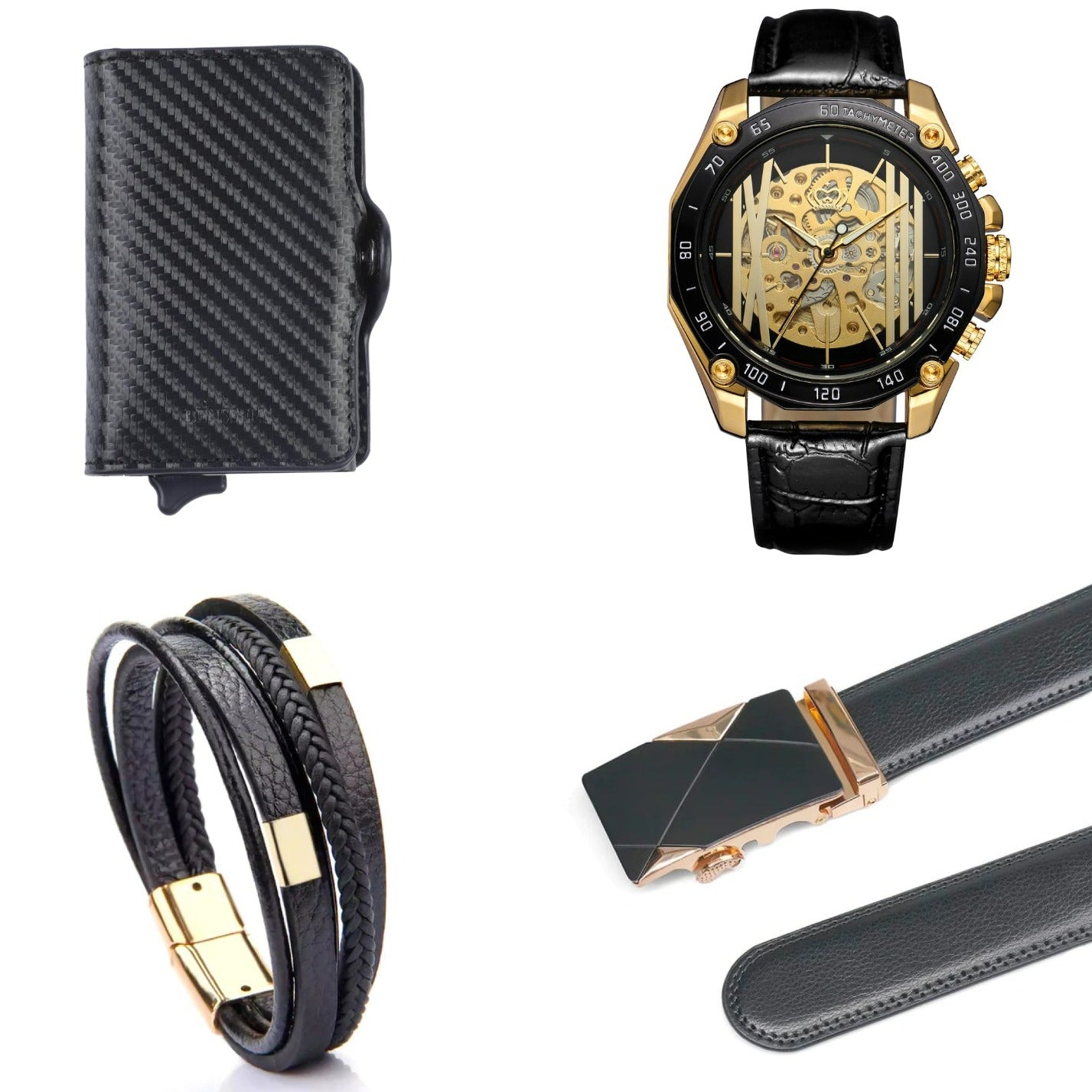 Heren Sieraden Geschenkset met Benssens Kaarthouder Armband Riem en Skeleton opwind Horloge Set Mano