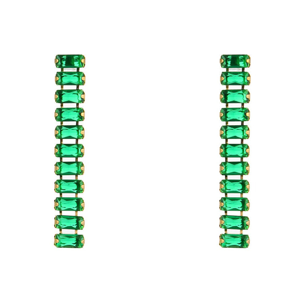 Dit is een bijzondere oorbel want deze  twee oorbellen bestaan uit 22 groene rechthoekige Zirconia steentjes vastgezet in houdertjes. Deze Zirconia's vormen samen een oorbel.  De achterkant en de schakels zijn gemaakt van (18K) stainless steel en vormen een mooi geheel samen. Dit prachtige sieraad is los verkrijgbaar maar is ook verkrijgbaar als set die bestaat uit een halsketting, armband en dus oorbellen.