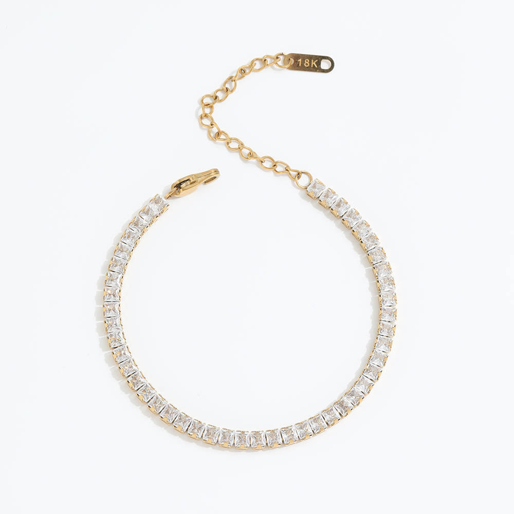 Dit is een bijzondere armband met 46 witte vierkante Zirconia steentjes, vastgezet in houdertjes. Deze prachtig Zirconia's vormen samen deze armband. De achterkant en de schakels zijn gemaakt van (18K) stainless steel en vormen een mooi geheel samen met de stenen. Als sluiting is een karabijnsluiting gebruikt. Dit prachtige sieraad is los verkrijgbaar maar ook als set die bestaat uit een halsketting, armband en oorbellen.