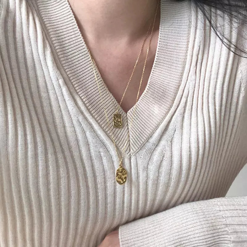 Deze ketting is gemaakt van anker schakels. De hanger is een gehamerd en rechthoekig stuk stainless steel. Dit hameren heeft ervoor gezorgd dat het net lijkt of er druppels van Stainless steel op de hanger zijn terecht gekomen. De ketting komt bij elkaar in een karabijn sluiting. Dat maakt deze ketting zeer opvallend en geschikt voor elke gelegenheid.