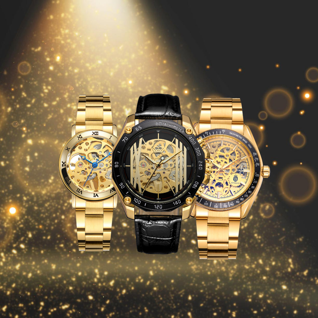 Heren Horloge Benssens goudkleurig Stainless Steel opwindbaar Skeleton met Glow in the dark wijzers Florence