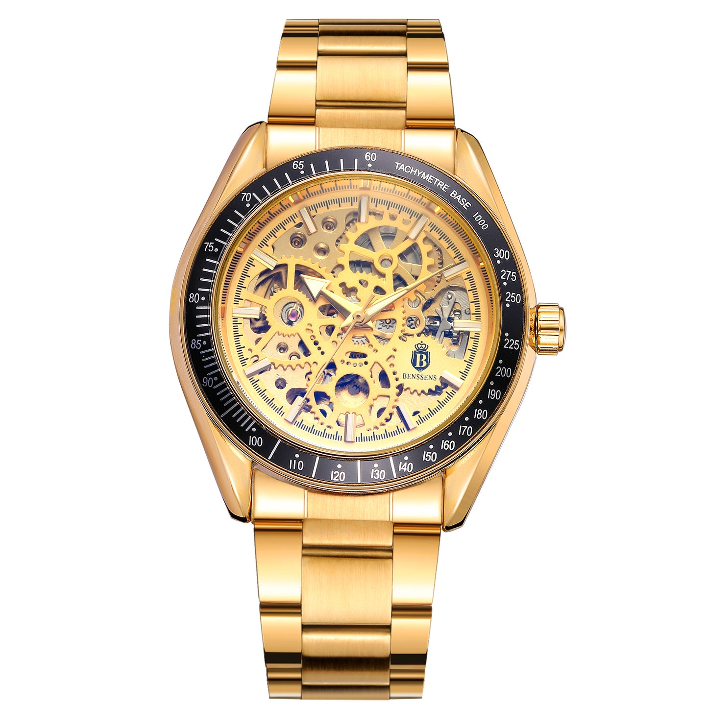 Heren Horloge Benssens goudkleurig Stainless Steel opwindbaar Skeleton met Glow in the dark wijzers Florence