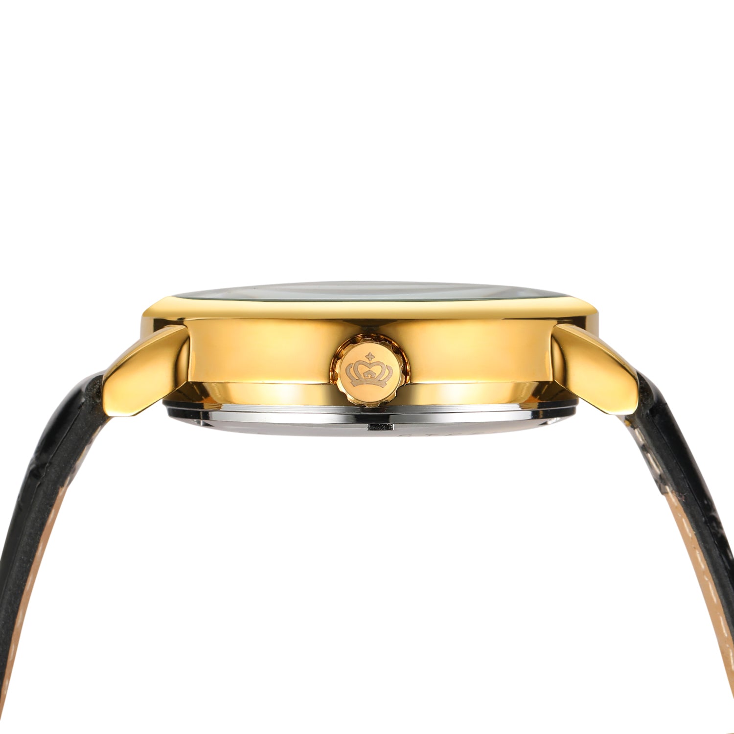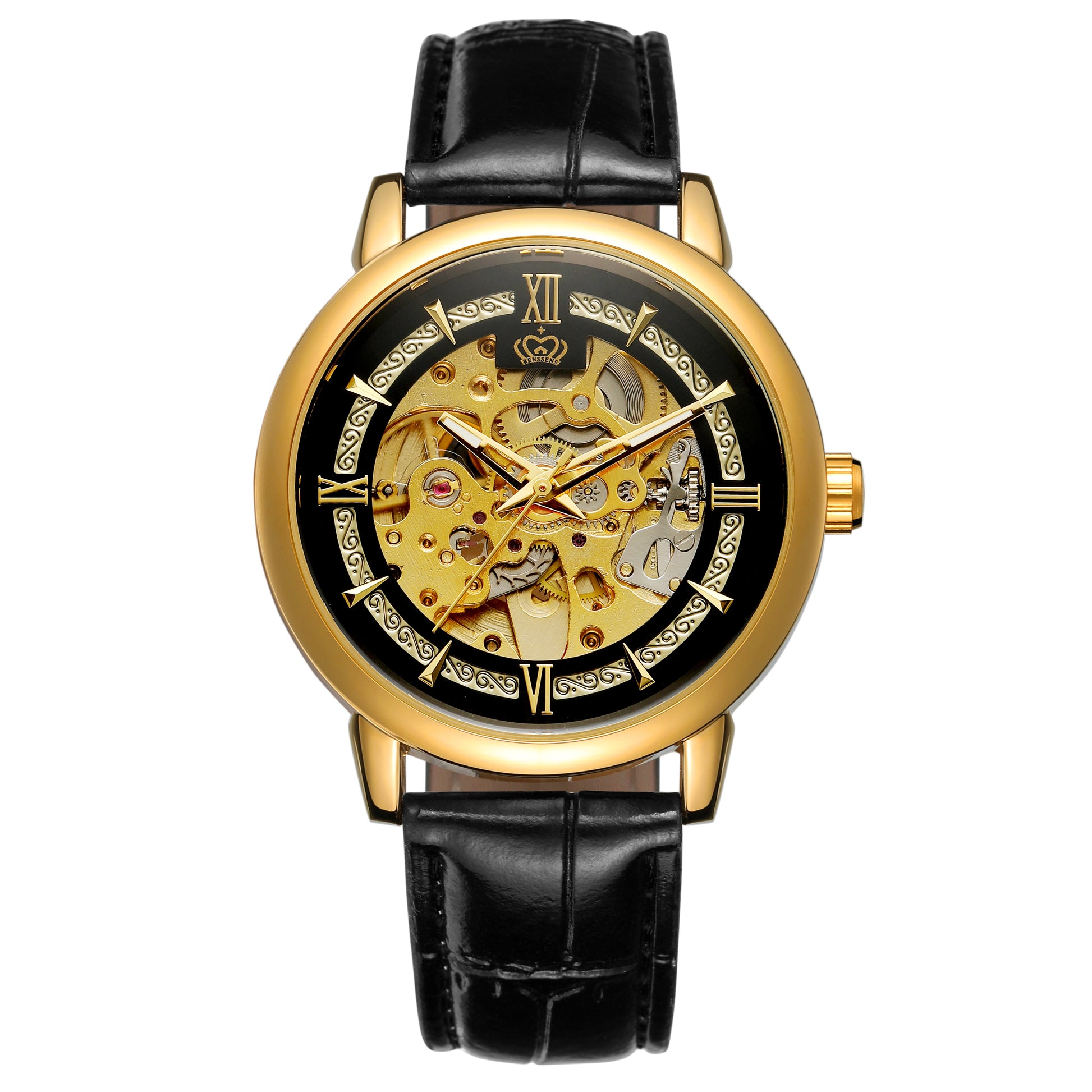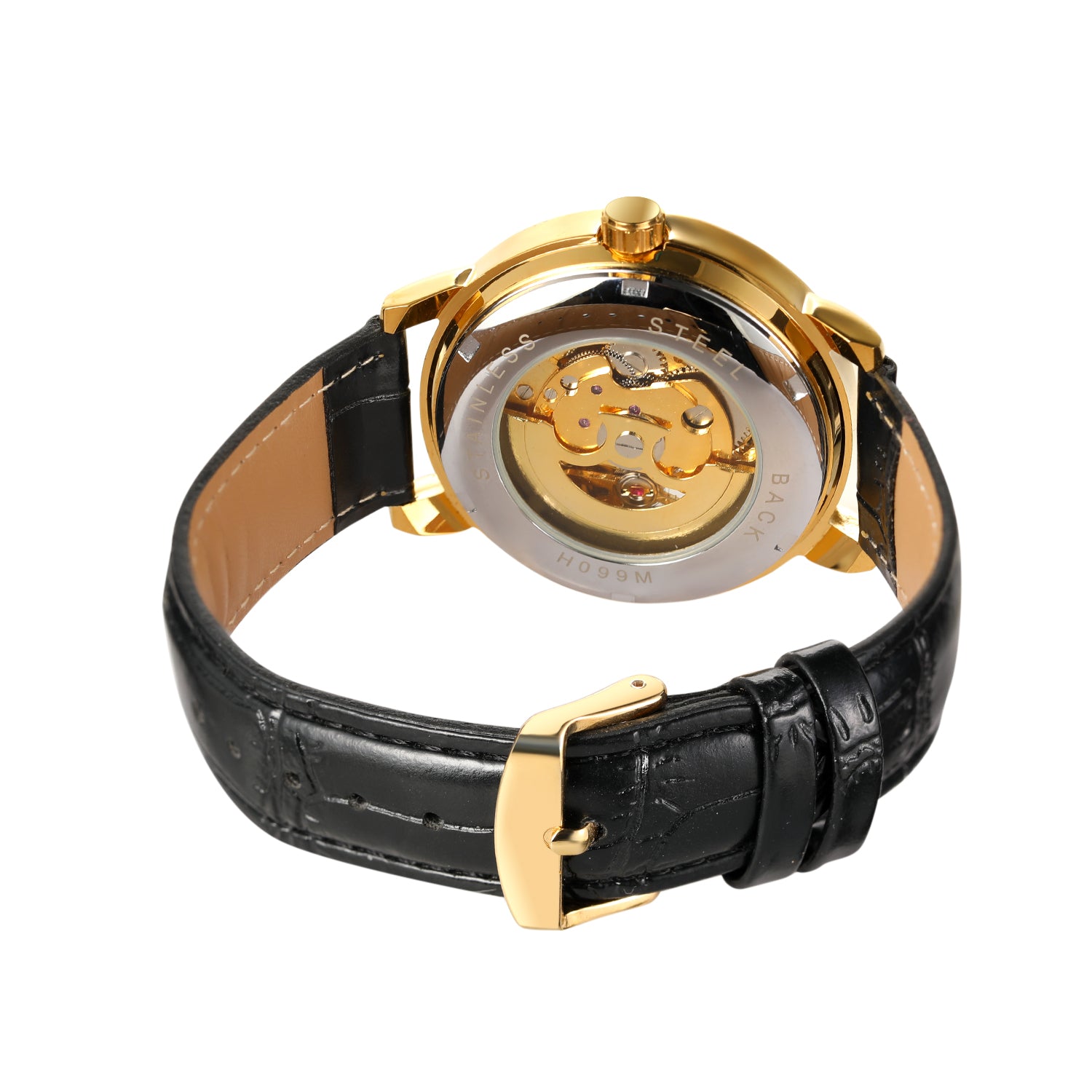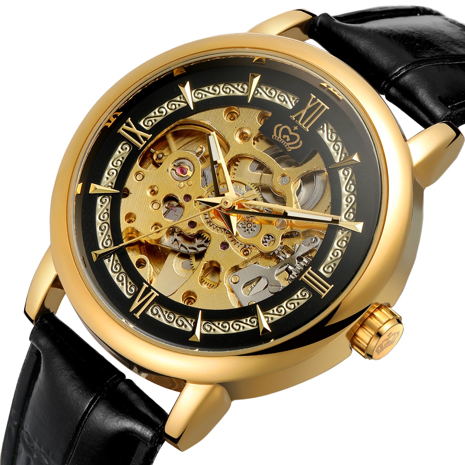 Heren Skeleton opwind goudkleurig horloge van Benssens met zwarte leren band